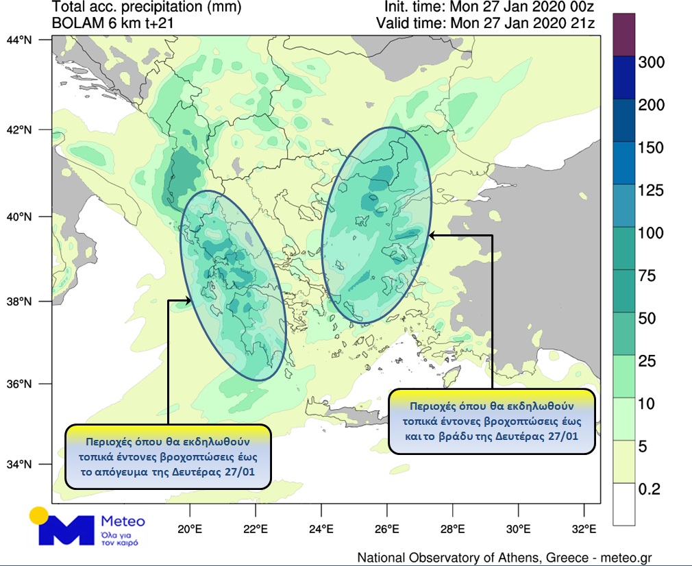 Στο χάρτη που ακολουθεί φαίνεται ο ολικός υετός που αναμένεται έως το βράδυ της Δευτέρας 27/01 καθώς και οι περιοχές όπου αναμένονται τα σημαντικότερα φαινόμενα.