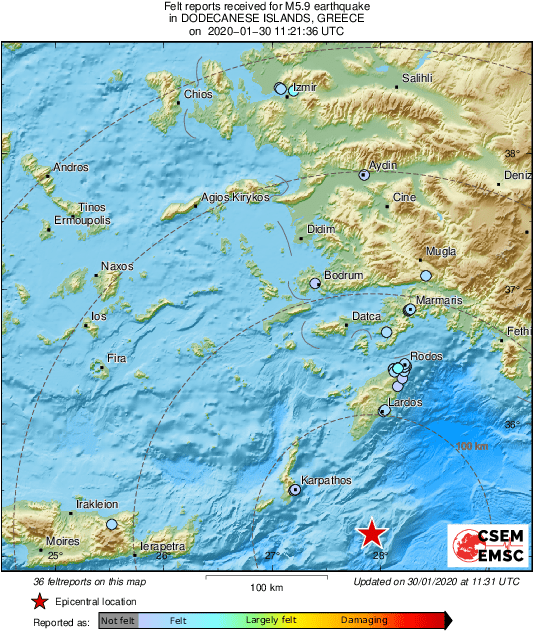 Σεισμός μεγέθους 5,9 βαθμών της κλίμακας Ρίχτερ σημειώθηκε ανοιχτά της Καρπάθου, σύμφωνα με το Ευρωμεσογειακό Ινστιτούτο, με το επίκεντρο της σεισμικής δόνησης να εντοπίζεται 71 χλμ. νοτιοανατολικά της Καρπάθου και 156 χλμ. νότια της Ρόδου. Το εστιακό του βάθος υπολογίζεται στα 10 χλμ.