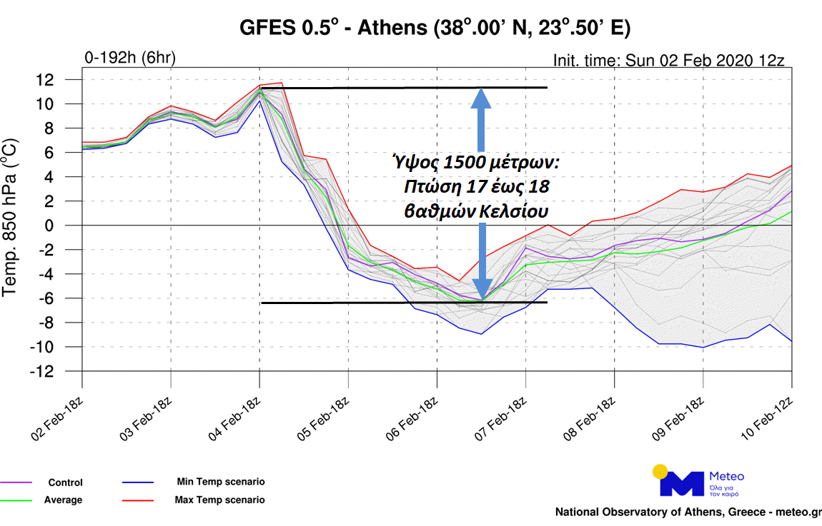 Τα επικρατέστερα σενάρια μεταβολής της θερμοκρασίας στο ίδιο ύψος επάνω από την Αττική φαίνονται στο σχετικό γράφημα.