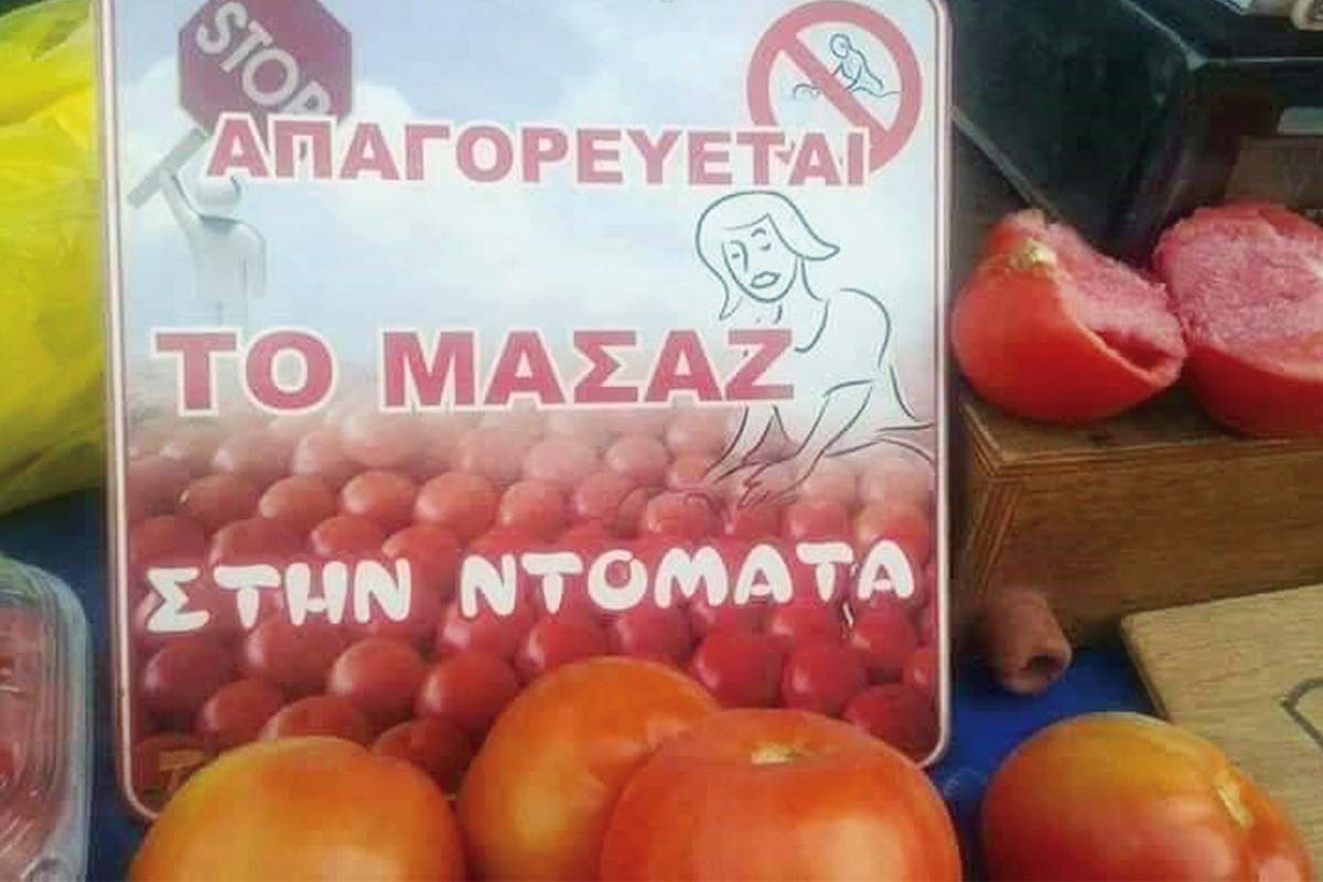 Η απαγόρευση για μασάζ στην ντομάτα είναι ευρηματική και πολύ δε περισσότερο δίνει όλη την εικόνα με τα δάχτυλα να τη ζουλούν και να τη γυρίζουν ταυτόχρονα σαν να θέλουν να ανακαλύψουν τη γεύση της!