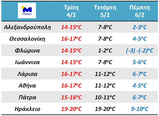 Ψυχρές αέριες μάζες θα επηρεάσουν τον καιρό της χώρας μας από τις πρώτες ώρες της Τετάρτης 05/02 και από βορειοδυτικά προς νοτιοανατολικά. Πιο αναλυτικά, αναμένεται θεαματική πτώση της θερμοκρασίας από τις πρώτες ώρες της Τετάρτης 05/02, ενώ μικρή άνοδος θα σημειωθεί την Παρασκευή 07/02. Στον πίνακα που παρουσιάζει τις μέγιστες θερμοκρασίες που αναμένονται κατά το τριήμερο Τρίτη 04/02 – Πέμπτη 06/02 σε 8 μεγάλες πόλεις της χώρας, φαίνεται ότι σε περιοχές όπως η Δυτική Μακεδονία η συνολική πτώση της θερμοκρασίας θα φτάσει και ενδεχομένως θα ξεπεράσει τους 15 περίπου βαθμούς, ενώ στα περισσότερα ηπειρωτικά η πτώση θα είναι μεταξύ 10 και 12 βαθμών.