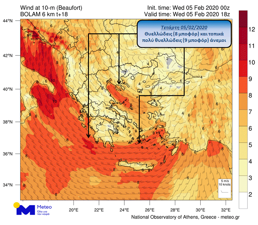 Για το υπόλοιπο της Τετάρτης 05/02 οι άνεμοι θα πνέουν από δυτικές έως βορειοδυτικές διευθύνσεις έως 8 και τοπικά έως 9 μποφόρ. Στο σχετικό χάρτη φαίνεται η διεύθυνση και η ταχύτητα του ανέμου το απόγευμα της Τετάρτης 05/02. Την Πέμπτη 06/02 οι άνεμοι θα στραφούν σε βόρειους και θα παρουσιάσουν μικρή εξασθένηση.