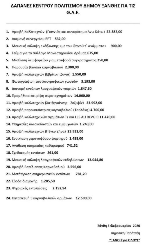 Μάλιστα, η παράταξη “Πολίτες για την Ξάνθη” γνωστοποίησε μια λίστα όπου αναγράφονται αναλυτικά όλα τα ποσά που καταβάλλονται σε καλλιτέχνες και πρόσωπα που συμμετέχουν στις Θρακικές Λαογραφικές Εορτές (ΘΛΕ).