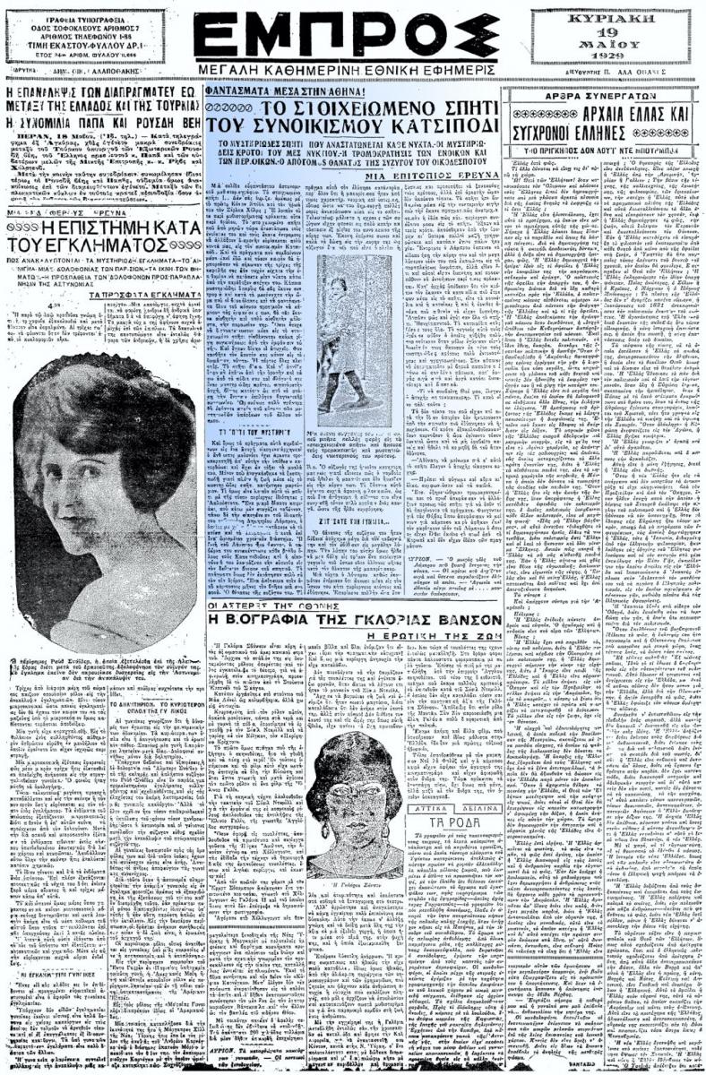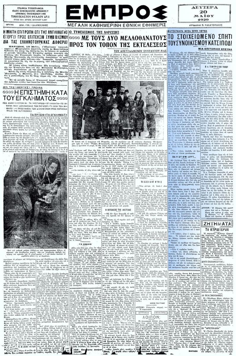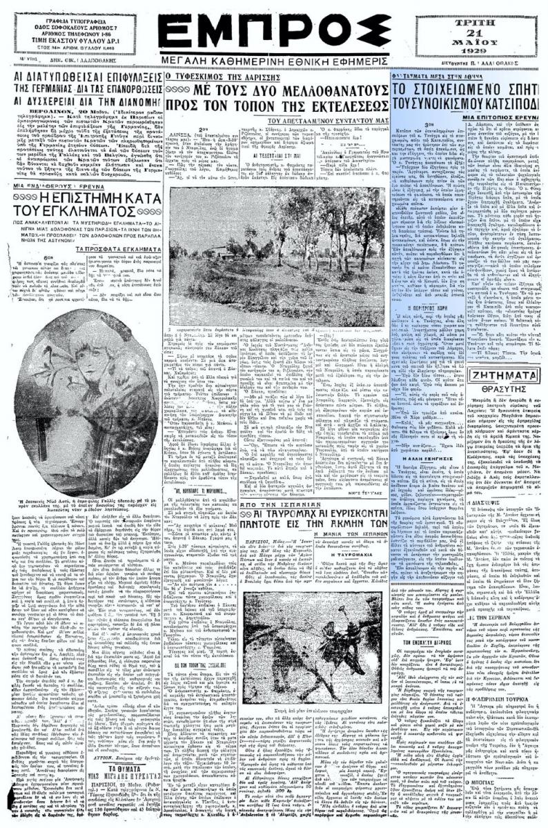 Η είδηση δημοσιεύθηκε στην εφημερίδα “ΕΜΠΡΟΣ”, στις 20/05/1929