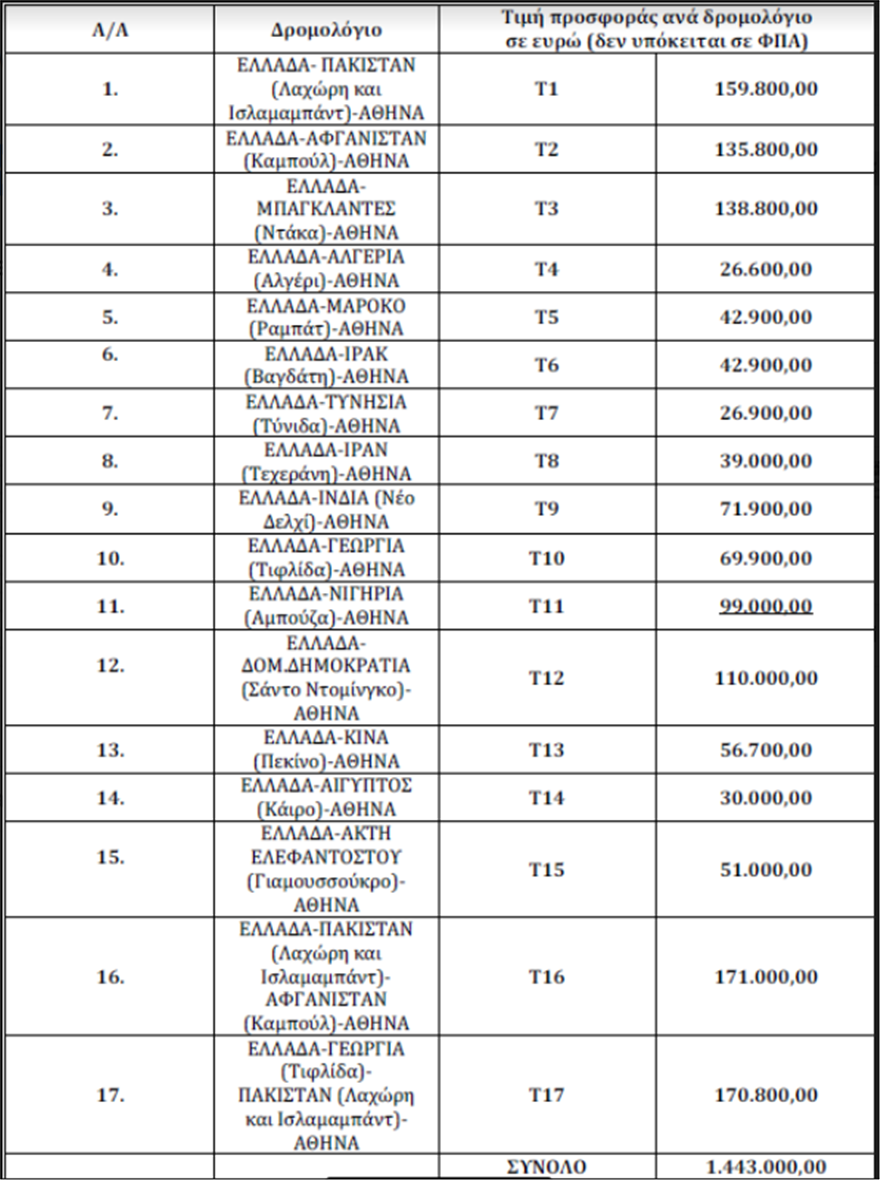 Βάσει της λίστας των 17 προορισμών επαναπροώθησης, το κόστος της πτήσης, «Ελλάδα-Πακιστάν(Λαχώρη και Ισλαμαμπάντ)-Αφγανιστάν(Καμπούλ)-Αθήνα» ανέρχεται σε 171.000 ευρώ, το ταξίδι «Ελλάδα-Πακιστάν-Αθήνα», πραγματοποιείται έναντι 159.800 ευρώ και η πτήση, «Ελλάδα-Αφγανιστάν-Αθήνα», κοστίζει 135.800 ευρώ.