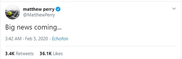 Κάποιοι από τους πιστούς θαυμαστές της δημοφιλούς σειράς «Friends» σκέφτηκαν ότι ενδεχωμένος ο Μάθιου Πέρι να επιβεβαίωσε όλες τις φήμες όταν έγραψε στο Twitter ότι «μεγάλα νέα έρχονται …», την περασμένη εβδομάδα.