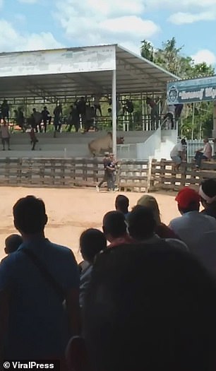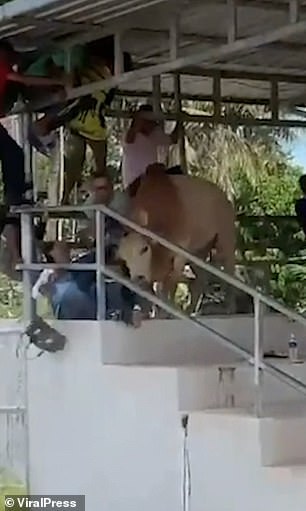 Στο σχετικό βίντεο που κυκλοφόρησε φαίνονται οι πανικοβλημένοι θεατές που φεύγουν απ΄όπου μπορούν ο καθένας την στιγμή που ο ταύρος κατόρθωσε να εισβάλει στις κερκίδες.