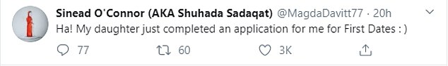 Η Sinead O’Connor επιβεβαίωσε τις πληροφορίες ότι η κόρη της υπέβαλε αίτηση για το ριάλιτι με ραντεβού First Dates με την ελπίδα να βρει τον έρωτα.
