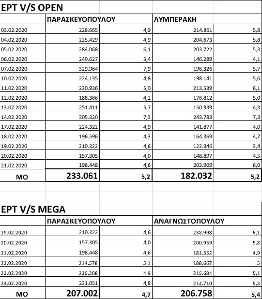 Οι πίνακες τηλεθέασης για Mega, Open TV και ΕΡΤ