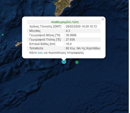 Σύμφωνα με το Γεωδυναμικό Ινστιτούτο του Εθνικού Αστεροσκοπείου Αθηνών, ο σεισμός είχε επίκεντρο θαλάσσια περιοχή 80 χλμ νοτιοανατολικά της Καρπάθου.