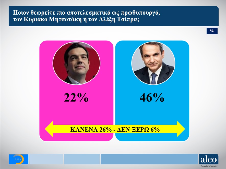 Τέλος, σε ερώτηση για ποιον θεωρούν πιο αποτελεσματικό ως πρωθυπουργό, το 46% απάντησε τον Κυριάκο Μητσοτάκη, το 26% απάντησε κανέναν από τους δύο, το 22% τον Αλέξη Τσίπρα και το 6% δεν ξέρει/δεν απαντά.