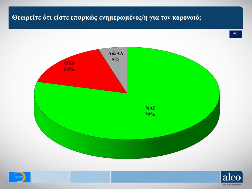 Για το αν είναι επαρκώς ενημερωμένοι για τον κορωνοϊό, το 79% απάντησε «ναι», το 16% «όχι» και το 5% δεν ξέρει/ δεν απαντά.