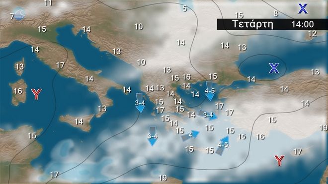 Ανεμοι: Αρχικά νότιοι νοτιοανατολικοί 4 με 6 μποφόρ, που βαθμιαία θα στραφούν σε δυτικούς βορειοδυτικούς και τις βραδινές ώρες θα φθάσουν πρόσκαιρα τοπικά τα 7 μποφόρ.