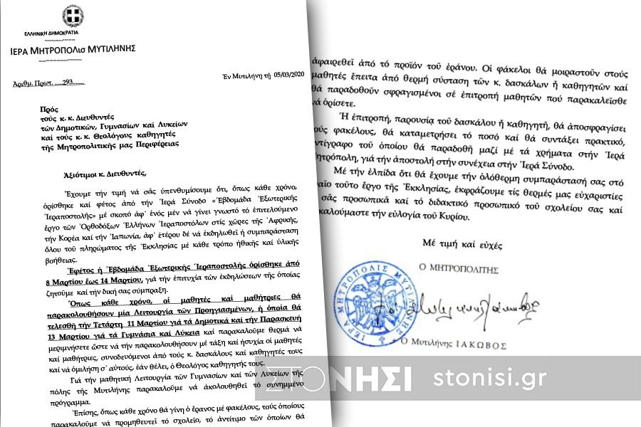 Όπως αποκαλύπτει το τοπικό site stonisi.gr, μόλις την περασμένη Πέμπτη 5 Μαρτίου η Μητρόπολη έστειλε εγκύκλιο στις Διευθύνσεις Πρωτοβάθμιας και Δευτεροβάθμιας Εκπαίδευσης καλώντας να παρακολουθήσουν ομαδικά μια λειτουργία των προηγιασμένων.