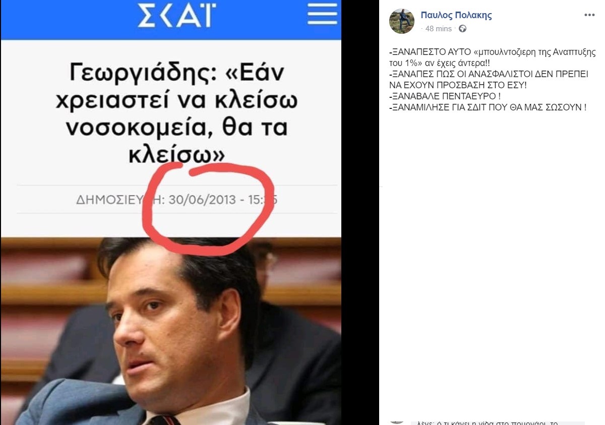 Η δήλωση προέρχεται από το 2013 και σύμφωνα με το ρεπορτάζ του ΣΚΑΪ, ο Ά. Γεωργιάδης φέρεται να λέει: «Αν χρειαστεί να κλείσω νοσοκομεία, θα τα κλείσω».