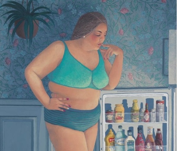 Όσους φρόντισαν να αδειάσουν σουπερμάρκετ για να γεμίσουν ψυγείο και καταψύκτες, η Shona McAndrew με τον πίνακά της «Asia» (2019) προτρέπει να απολαύσουν με νεγκλιζέ αμφίεση ένα σνακ όποια ώρα της νύχτας – και της μέρας.