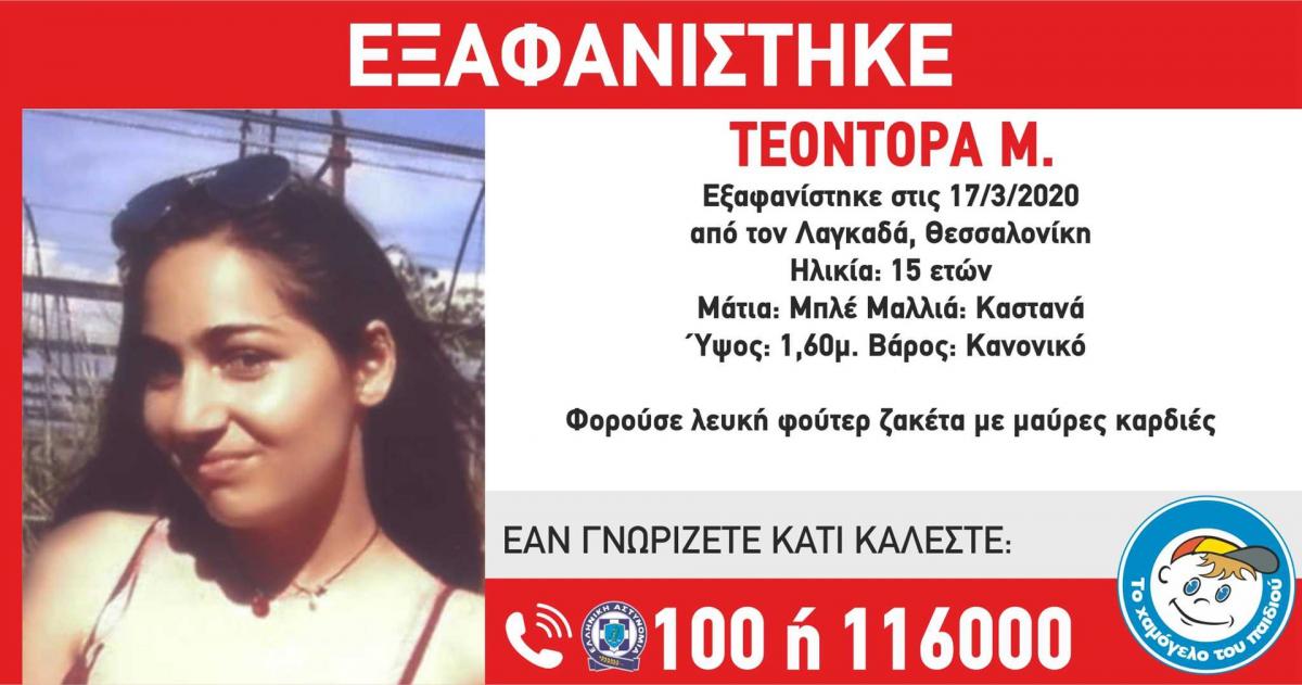 Συναγερμός έχει σημάνει στις Αρχές για την εξαφάνιση 15χρονης, τα ίχνη της οποίας χάθηκαν το πρωί της Τρίτης. Πρόκειται για την Τεοντόρα Μ., βουλγαρικής καταγωγής, η οποία εξαφανίστηκε στις 17/3/2020, στις 07:30, από το σπίτι της στην περιοχή Ηράκλειο του Δήμου Λαγκαδά Θεσσαλονίκης.