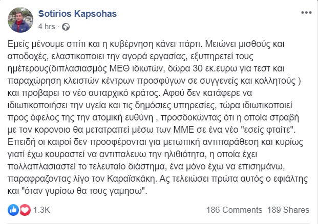 Τι έγραψε ο Σωτήρης Καψώχας στο facebook: