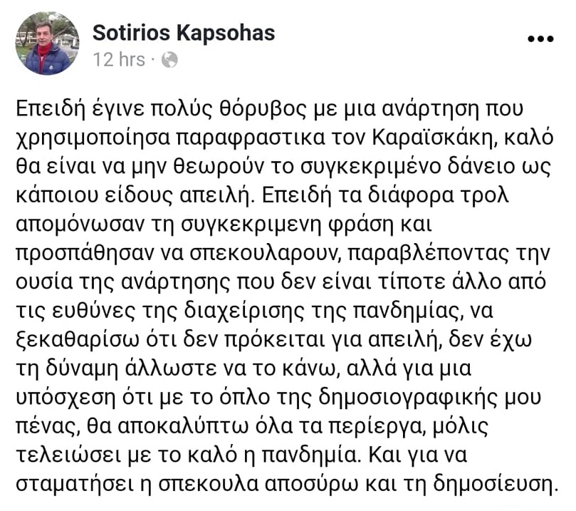 Επειδή τα διάφορα τρολ απομόνωσαν τη συγκεκριμένη φράση και προσπάθησαν να σπεκουλάρουν, παραβλέποντας την ουσία της ανάρτησης που δεν είναι τίποτε άλλο από τις ευθύνες της διαχείρισης της πανδημίας, να ξεκαθαρίσω ότι δεν πρόκειται για απειλή, δεν έχω τη δύναμη άλλωστε να το κάνω, αλλά για μια υπόσχεση ότι με το όπλο της δημοσιογραφικής μου πένας, θα αποκαλύπτω όλα τα περίεργα, μόλις τελειώσει με το καλό η πανδημία. Και για να σταματήσει η σπέκουλα αποσύρω και τη δημοσίευση», αναφέρει συγκεκριμένα ο Σωτήρης Καψώχας.
