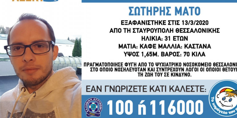 Δυστυχώς, η σορός του 31χρονου βρέθηκε σε περιοχή της Ευκαρπίας. Σύμφωνα με πληροφορίες, οι αρχές φέρεται να έχουν αποκλείσει το ενδεχόμενο της εγκληματικής ενέργειας. Η εξαφάνισή του είχε δηλωθεί στις 13 Μαρτίου, όταν είχε διαφύγει από το Ψυχιατρικό Νοσοκομείο Θεσσαλονίκης, όπου νοσηλευόταν.