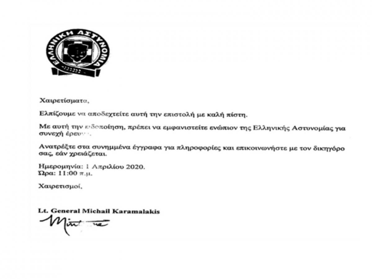 Μια νέα διαδικτυακή απάτη έκανε την εμφάνισή της εν μέσω κορωνοϊού, η οποία αναπαράγεται με e-mail. Το μήνυμα που κυκλοφορεί αναφέρει μεταξύ άλλων ότι οι παραλήπτες του πρέπει να εμφανιστούν ενώπιον της Ελληνικής Αστυνομίας και να ανατρέξουν στα συνημμένα έγγραφα.