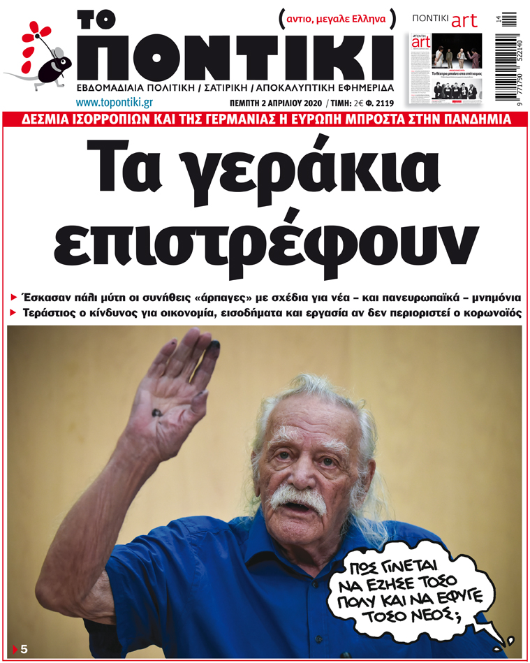Με πρωτοσέλιδο τίτλο «Τα γεράκια επιστρέφουν» και αναλυτικό-αποκαλυπτικό ρεπορτάζ για τους συνήθεις «άρπαγες» με σχέδια για νέα – και πανευρωπαϊκά – μνημόνια και τον τεράστιο κίνδυνο για οικονομία, εισοδήματα και εργασία αν δεν περιοριστεί ο κορωνοϊός, κυκλοφορεί το «ΠΟΝΤΙΚΙ» το πρωί της Πέμπτης.