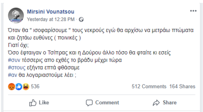 Όταν θα ” ισοφαρίσουμε ” τους νεκρούς εγώ θα αρχίσω να μετράω πτώματα και ζητάω ευθύνες ( ποινικές )