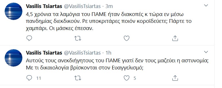 Συγκεκριμένα, ο Τσιάρτας μέσω Twitter επιτέθηκε στο ΠΑΜΕ γράφοντας «4,5 χρόνια τα λαμόγια του ΠΑΜΕ ήταν διακοπές κ τώρα εν μέσω πανδημίας διεκδικούν. Ρε υποκριτάρες ποιόν κοροϊδεύετε; Πάρτε το χαμπάρι. Οι μάσκες έπεσαν».