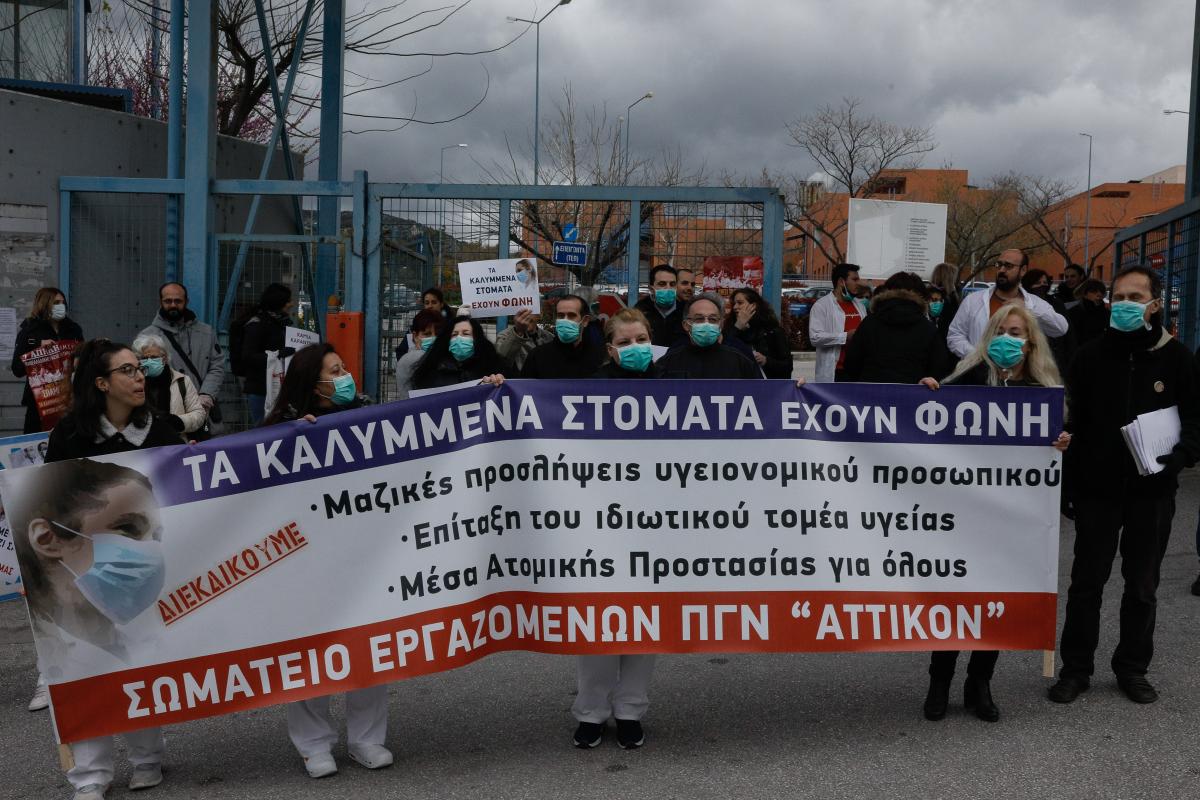 Ακολουθούν στιγμιότυπα της κινητοποίησης σήμερα το πρωί στην πύλη του νοσοκομείου αναφοράς για κορωνοϊό Αττικόν.