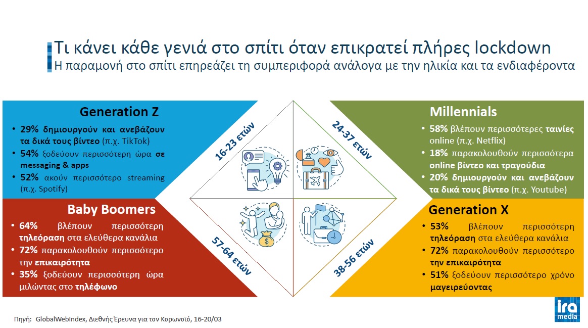 Τέλος, από τη γενιά 57-64 ετών, το 72% παρακολουθεί περισσότερο επικαιρότητα, το 64% βλέπει περισσότερη τηλεόραση στα ελεύθερα κανάλια και το 35% ξοδεύει περισσότερη ώρα μιλώντας στο τηλέφωνο.