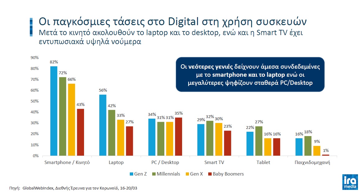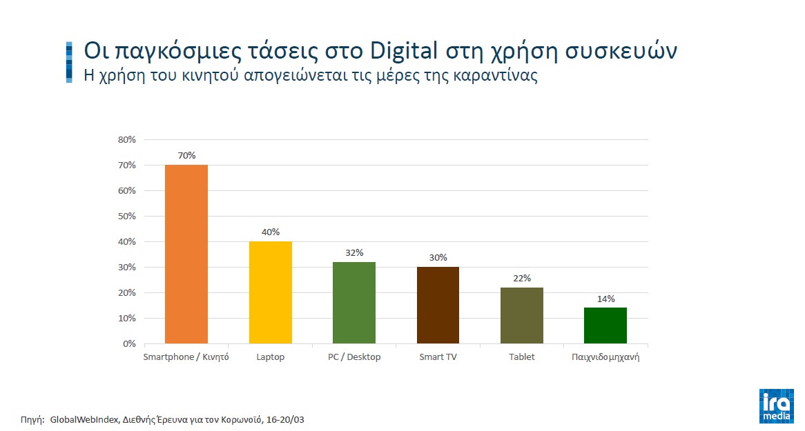 Συγκεκριμένα, τα αποτελέσματα της Διεθνούς έρευνας για τον κορωνοϊό, που διεξήγαγε η Global Web Index και δημοσίευσε η Ira Media, έδειξαν ότι το 70% των ανθρώπων χρησιμοποιούν smartphones, το 40% laptop, το 32% PC/desktop, το 30% Smart TV, το 22% tablet και το 14% παιχνιδομηχανή.