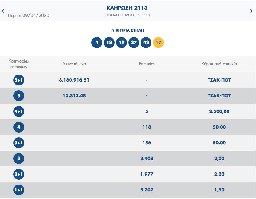 Στην κλήρωση 2113 της Πέμπτης δεν βρέθηκε νικητής ούτε στην πρώτη κατηγορία (5+1 σωστές προβλέψεις) ούτε στην δεύτερη (5 σωστές προβλέψεις).