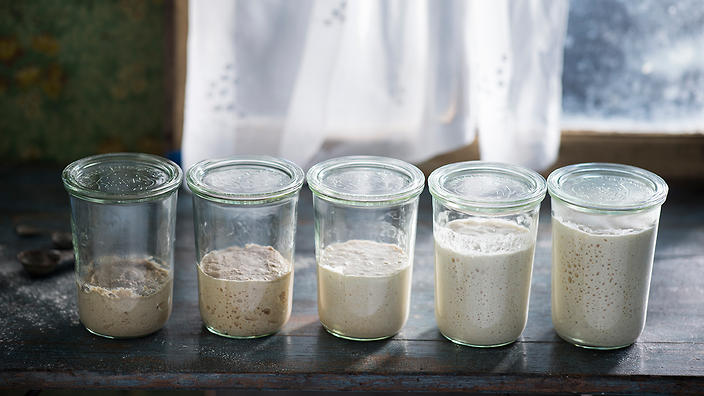 Ξεκινήστε με 60 γραμμάρια αλευριού ολικής αλέσεως και 60 γραμμάρια χλιαρού (μη χλωριωμένου) νερού. Ανακατέψτε καλά και θα έχετε ένα πολύ πηχτό μίγμα. Καλύψτε το δοχείο χαλαρά με διάφανη μεμβράνη και αφήστε το σε θερμοκρασία δωματίου, σε ένα σημείο όπου είναι ελαφρώς πιο ζεστά.