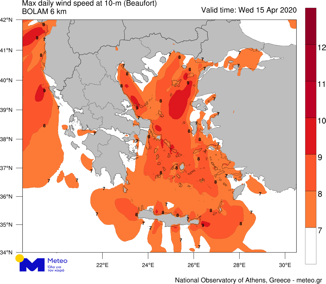 Περιοχές όπου ο άνεμος θα ξεπεράσει τα 7 μποφόρ (πορτοκαλί και κόκκινη σκίαση) τη Μ. Τετάρτη 15/04
