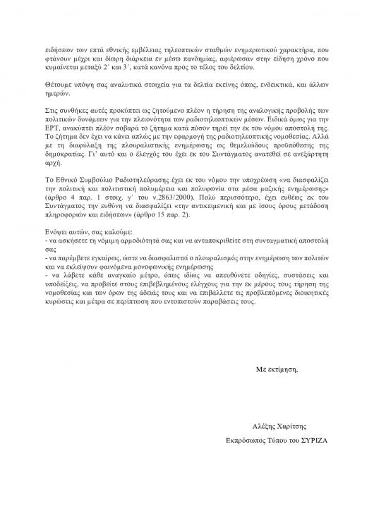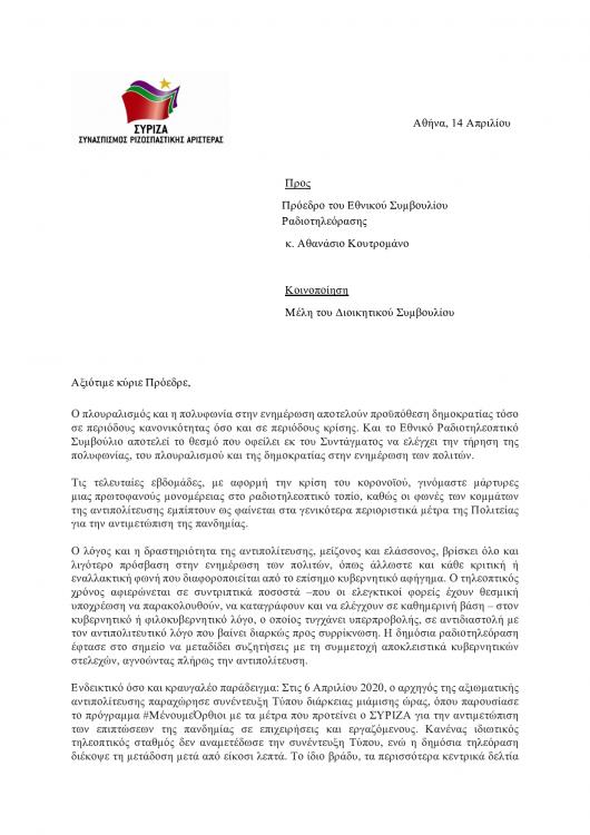 Την άμεση παρέμβαση του Εθνικού Συμβουλίου Ραδιοτηλεόρασης «ώστε να διασφαλιστεί ο πλουραλισμός στην ενημέρωση των πολιτών και να εκλείψουν φαινόμενα μονοφωνικής ενημέρωσης» απαιτεί με επιστολή του προς τον πρόεδρο του ΕΣΡ, Αθ. Κουτρομάνο, ο εκπρόσωπος Τύπου του ΣΥΡΙΖΑ και βουλευτής Μεσσηνίας, Αλέξης Χαρίτσης, επισημαίνοντας πως «τις τελευταίες εβδομάδες, με αφορμή την κρίση του κορονοϊού, γινόμαστε μάρτυρες μιας πρωτοφανούς μονομέρειας στο ραδιοτηλεοπτικό τοπίο, καθώς οι φωνές των κομμάτων της αντιπολίτευσης εμπίπτουν ως φαίνεται στα γενικότερα περιοριστικά μέτρα της Πολιτείας για την αντιμετώπιση της πανδημίας».
