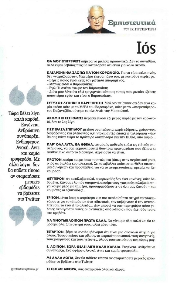 Για τις μέρες που πέρασε άρρωστος, έχοντας διαγνωστεί θετικό στον κορωνοϊό, περιγράφει σε σημερινό του άρθρο στα Νέα ο Γιάννης Πρετεντέρης.