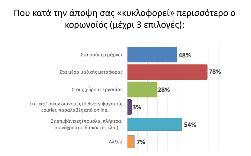 Σύμφωνα με έρευνα της εταιρείας Interview, που δημοσιεύει το Πρώτο Θέμα προκύπτει ότι τα Μέσα Μαζικής Μεταφοράς με ποσοστό 78% είναι το σημείο, όπου οι ερωτώμενοι θεωρούν ότι «κυκλοφορεί» περισσότερο ο κορωνοϊός.