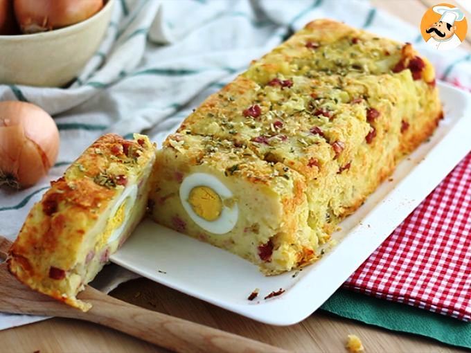 Αλευροβουτυρώστε μια μακρόστενη φόρμα για κέικ. Βάλτε το μισό μίγμα του πουρέ πατάτας και πιέστε το καλά ώστε να απλωθεί ομοιόμορφα στη φόρμα.