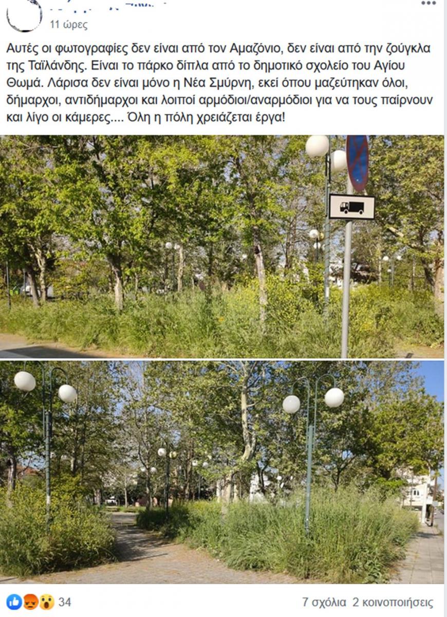 Νέο «κρούσμα» ενός τέτοιου σημείου όπου τα χόρτα έχουν… οργιάσει, είναι το πάρκο δίπλα από το δημοτικό σχολείο του Αγίου Θωμά, από όπου και οι φωτογραφίες, σύμφωνα με ανάρτηση κατοίκου της Λάρισας στα social media.