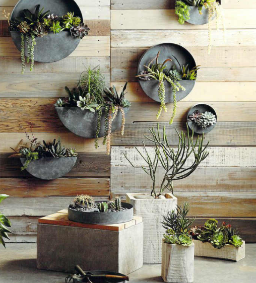 Σε ένα ξύλινο πάνελ κατασκευασμένο από διαφορετικούς τύπους ανακυκλωμένων σανίδων, έχουν τοποθετηθεί πολλές γρανιτένιες γλάστρες κάθετης φύτευσης. Τα πέτρινα εγχάρακτα κασπώ κάτω είναι το ίδιο μαγικά όπως και οι γλάστρες.