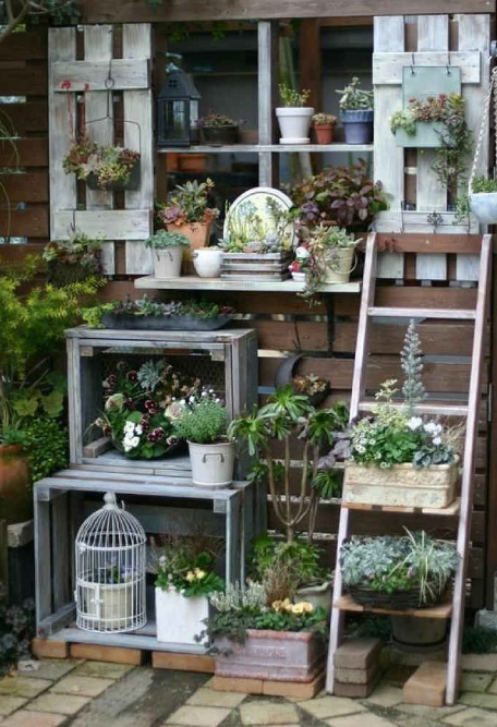 Καφάσια, φαναράκια, κλουβιά, διακοσμητική σκάλα και άλλα στοιχεία ρομαντικής και shabby chic διακόσμησης, δημιουργούν μια όμορφη κατάφυτη γωνιά με ανθεκτικά φυτά που θέλουν λίγο πότισμα.