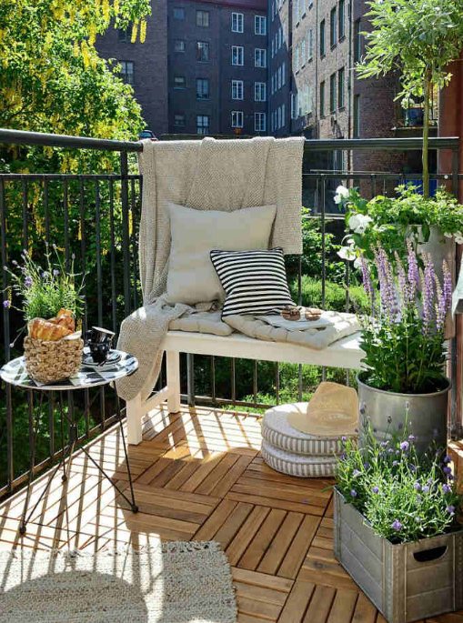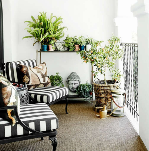 Η έξυπνη αυτή κατασκευή δημιούργησε ένα μπαρ που αγκαλιάζει το κάγκελο και στο κάτω μέρος της έχει θήκες για γλαστράκια. Πάνω βρίσκεται το πάσο και το είδος της κατασκευής είναι ιδιαίτερα σταθερό. Δύο πολυθρόνες και ένα τραπεζάκι, καλύπτουν το ζήτημα των θέσεων, ενώ το μικρό επιπλάκι προσφέρει θέσεις πάνω και κάτω για φυτά. Το φαναράκι, το ποτιστήρι και η ψάθινη θήκη γλάστρας αποτελούν μαζί με τον Βούδα το κερασάκι στην τούρτα.