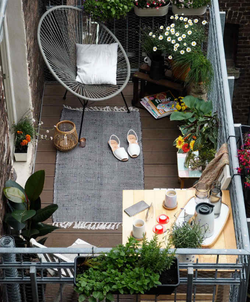 Σε ένα πολύ μικρό μπαλκόνι το τραπεζάκι τοποθετήθηκε στην γωνία με δύο καρέκλες, ενώ ο κήπος έγινε πιο ασφαλής με κοτετσόσυρμα. Για οικονομία χώρου οι περισσότερες γλάστρες τοποθετήθηκαν στα κάγκελα και το καφάσι, ενώ η πολυθρόνα ακαπούλκο είναι ο αδιαμφισβήτητος πρωταγωνιστής του χώρου.