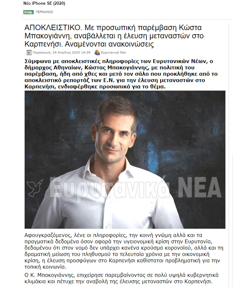 Η ιστοσελίδα evrytanika.gr φιλοξενεί «αποκλειστικό» ρεπορτάζ στο οποίο αναφέρεται ότι ο Κώστας Μπακογιάννης παρενέβη σε κυβερνητικά στελέχη ώστε να ακυρωθεί η μεταφορά 108 προσφύγων και μεταναστών στην πρωτεύουσα της Ευρυτανίας.
