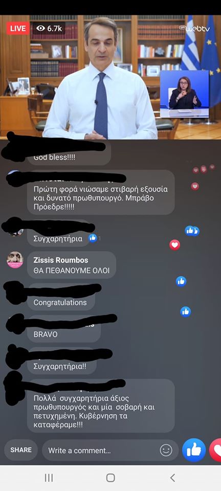 Συγκεκριμένα, ανάμεσα σε διάφορα θετικά σχόλια που έλαβε ο πρωθυπουργός όπως «Πρώτη φορά νιώσαμε στιβαρή εξουσία και δυνατό πρωθυπουργό. Μπράβο Πρόεδρε!», «God Bless», «Συγχαρητήρια», «Μπράβο» και «Πολλά συγχαρητήρια άξιος πρωθυπουργός και μια σοβαρή και πετυχημένη κυβέρνηση τα καταφέραμε!», ο ηθοποιός έγραψε «ΘΑ ΠΕΘΑΝΟΥΜΕ ΟΛΟΙ».