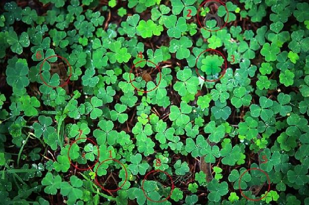 Η εικόνα σας ζητά να βρείτε τα οκτώ κρυμμένα σύμβολα καλής τύχης από διαφορετικούς πολιτισμούς παγκοσμίως σε ένα φόντο γεμάτο τριφύλλια.
