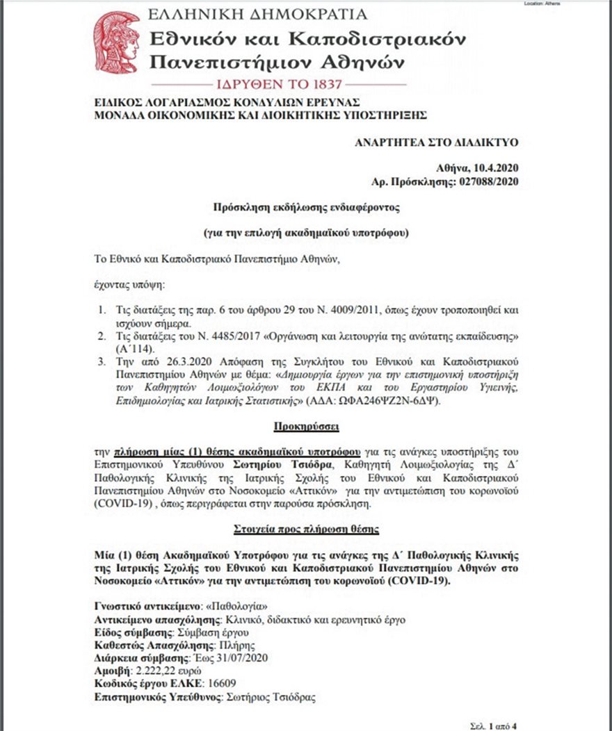 Τη δεύτερη εβδομάδα του περασμένου μήνα, το Εθνικό και Καποδιστριακό Πανεπιστήμιο Αθηνών (ΕΚΠΑ) προκήρυξε την πλήρωση μιας θέσης ακαδημαϊκού υποτρόφου για τις ανάγκες υποστήριξης του κ. Τσιόδρα στο Αττικόν. Ως γνωστικό αντικείμενο της θέσης αναφερόταν η Παθολογία, ενώ οριζόταν πλήρης απασχόληση σε κλινικό, διδακτικό και ερευνητικό έργο στη Δ’ Παθολογική Κλινική της Ιατρικής Σχολής του ΕΚΠΑ στο Αττικόν.