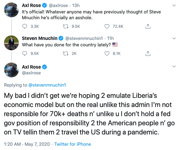 Δημόσιος καυγάς με βαριές εκφράσεις εκτυλίχθηκε στο Twitter μεταξύ του τραγουδιστή των Guns ‘n’ Roses, Axl Rose, και του υπουργού Οικονομικών των ΗΠΑ, Στιβ Μνούσιν, o οποίος ισχυρίστηκε ότι είναι μια «καλή εποχή για να ταξιδέυψει κανείς στις ΗΠΑ».