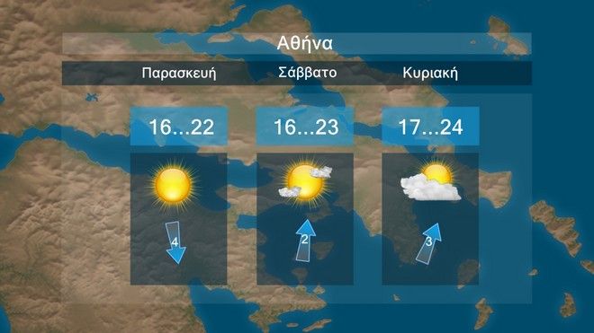 Στη Μακεδονία και τη Θράκη παροδικές νεφώσεις με τοπικές βροχές τις πρωινές ώρες και σταδιακή βελτίωση. Στις υπόλοιπες περιοχές νεφώσεις με τοπικές βροχές και σποραδικές καταιγίδες που αργά το απόγευμα θα περιοριστούν στην Πελοπόννησο και τη νότια νησιωτική χώρα και τη νύχτα θα εξασθενήσουν. Οι άνεμοι θα πνέουν από βόρειες διευθύνσεις 4 με 6 και στα πελάγη τοπικά 7 μποφόρ. Η θερμοκρασία θα σημειώσει πτώση.