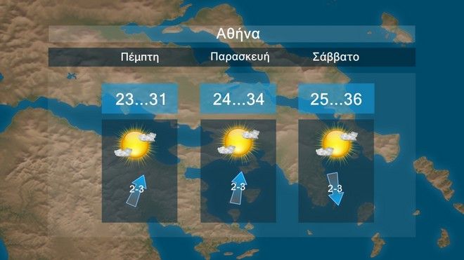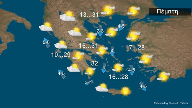 Καιρός: Γενικά αίθριος. Ανεμοι: Από βόρειες διευθύνσεις 3 με 4 και πρόσκαιρα τις πρωινές ώρες τοπικά 5 μποφόρ. Θερμοκρασία: Από 12 έως 32 βαθμούς Κελσίου.